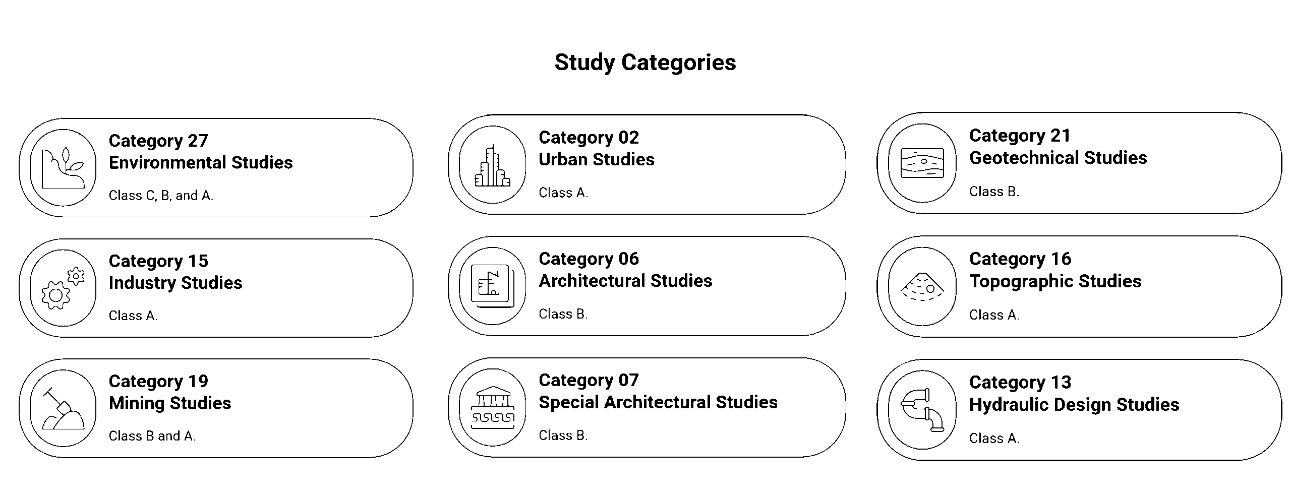 Our colleagues are certified and officially enrolled in the Study Record of the Ministry of Infrastructure for Transport and Networks for the following Categories: